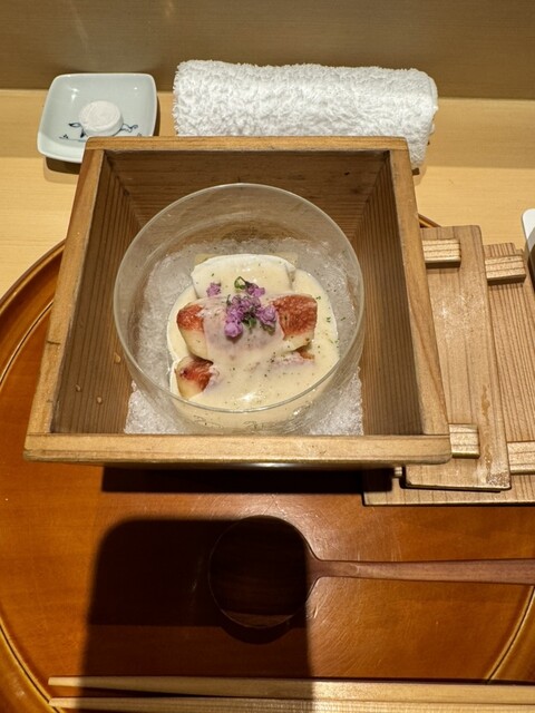 ○雲丹豆腐と帆立貝と伊勢海老と北寄貝の加減酢煮凝り掛け