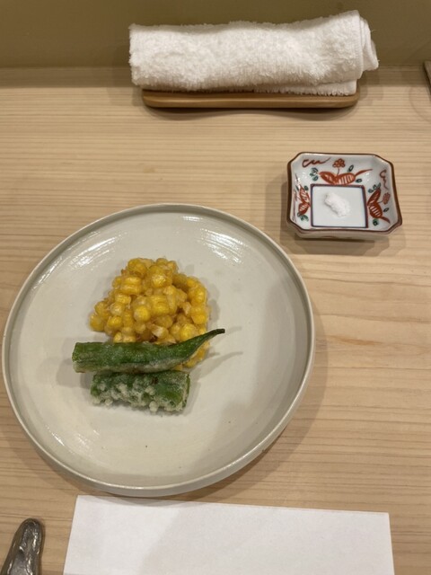 ○稚鮎、とうもろこし、アスパラガスの天麩羅