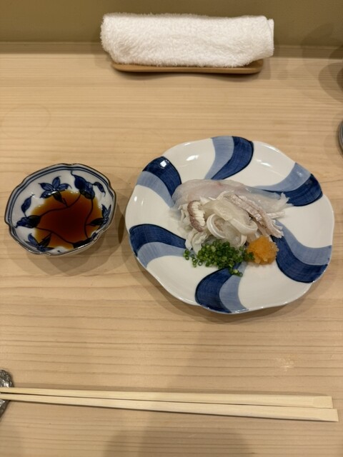 山口県産の河豚を使って、紅葉卸しと白子ポン酢の醤油を使って食べるのですが、河豚本来の歯ごたえや繊細な旨味が楽しめ美味しかったです。