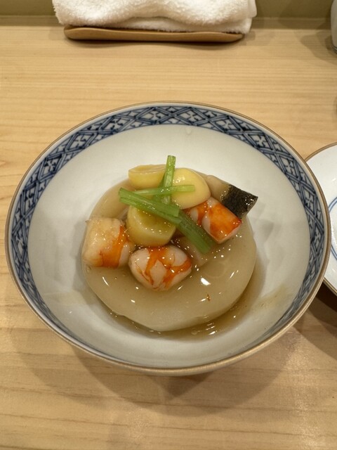 京都の蕪、上に掛けた銀杏と車海老と鮑の餡掛けが大振りの蕪の本来の味を引き立てており、とても美味しいです。