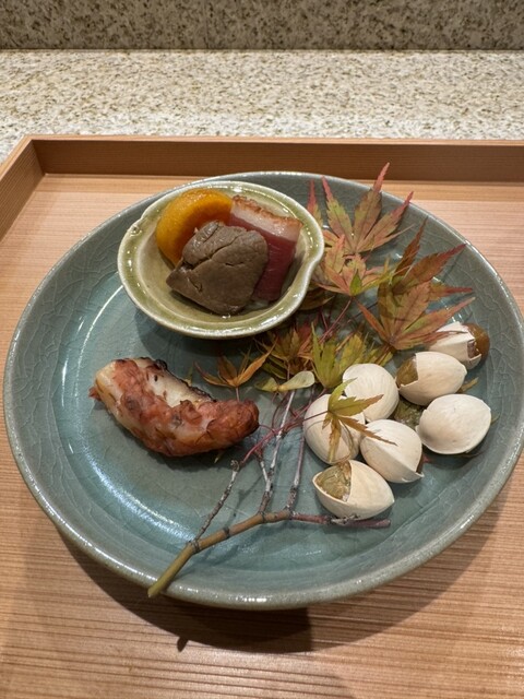 明石の鯛のもろみ味噌漬けと京都の合鴨の燻製と干し柿にクリームチーズを巻いた柿チーズと塩煎り銀杏と垢穢(くえ)の肝を炊いた一品。