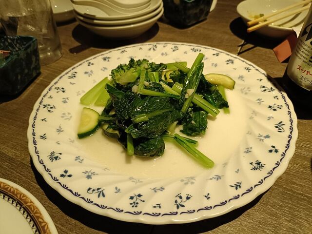 「やきとりハウス平安郷」でのゼロ次会を終え、本命の中華居酒屋「鮮藍坊(シェンランフォン)」を4年ぶりに訪問。今回は松・竹・梅みたいな「鮮-シェン」「藍-ラン」「坊-フォン」3コースのうち、8品2,500円の「鮮-シェン」に2h飲みホ1,200円を付けて、小中学校の同級生9名での宴会だ。