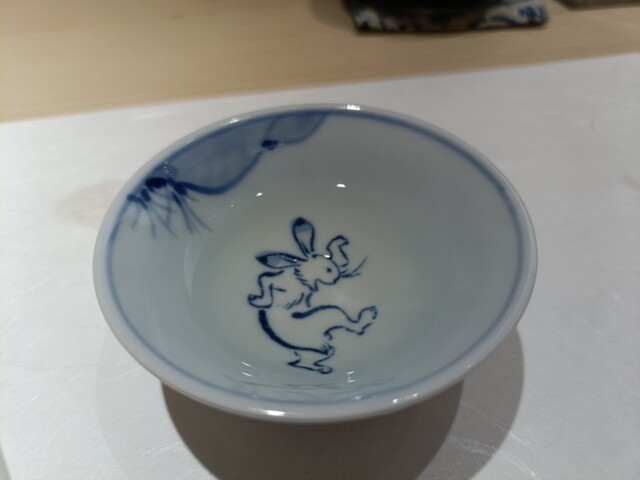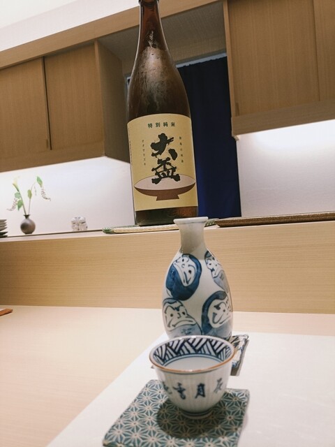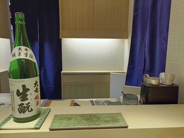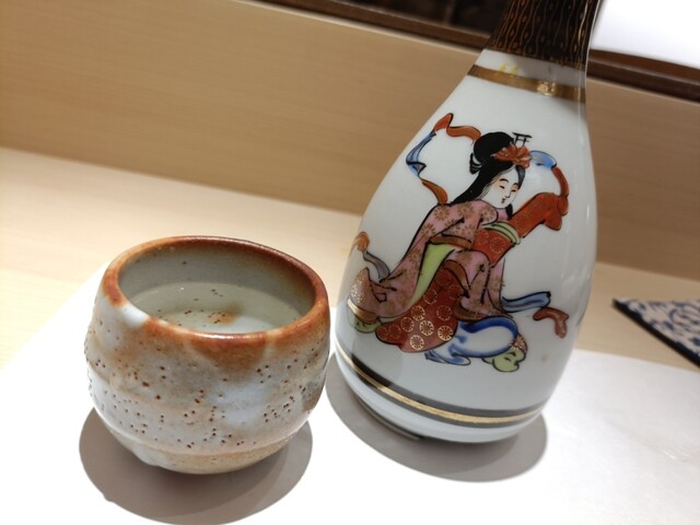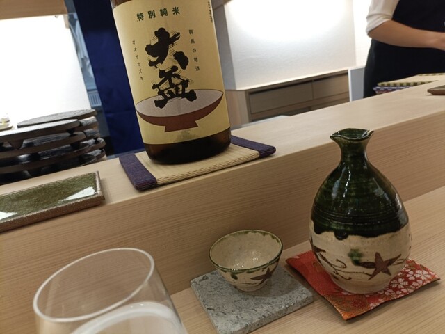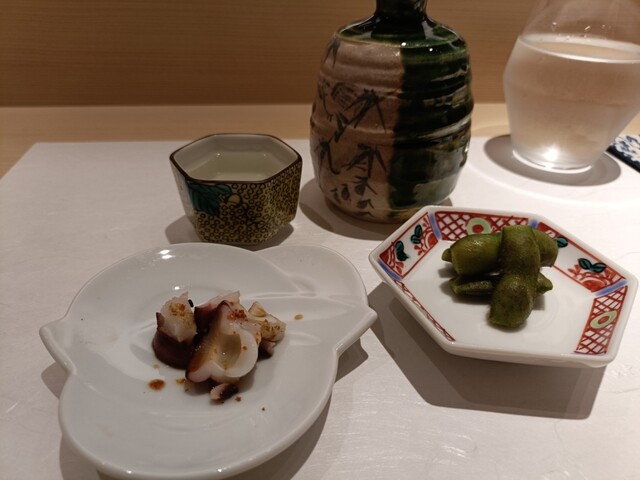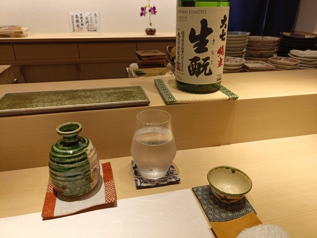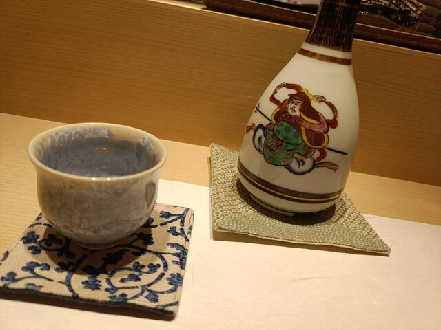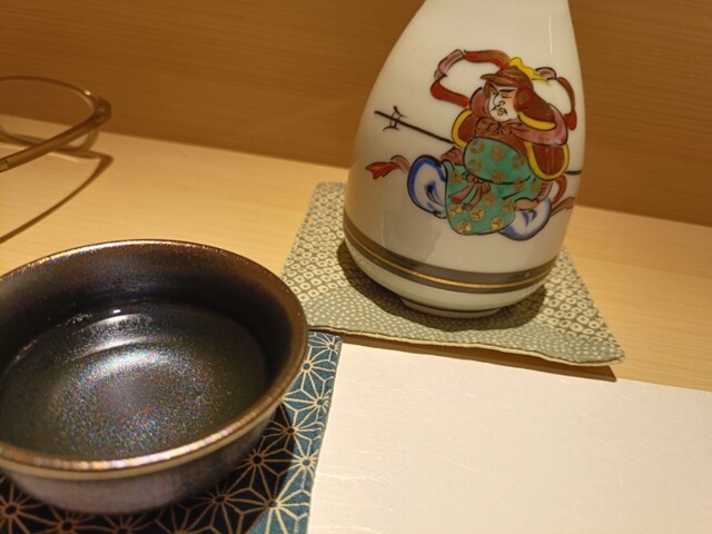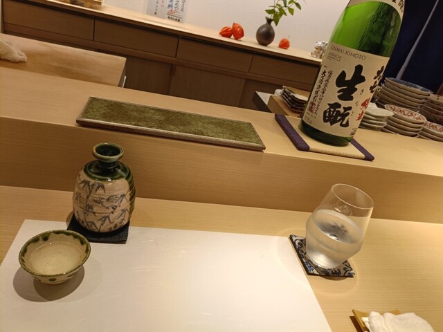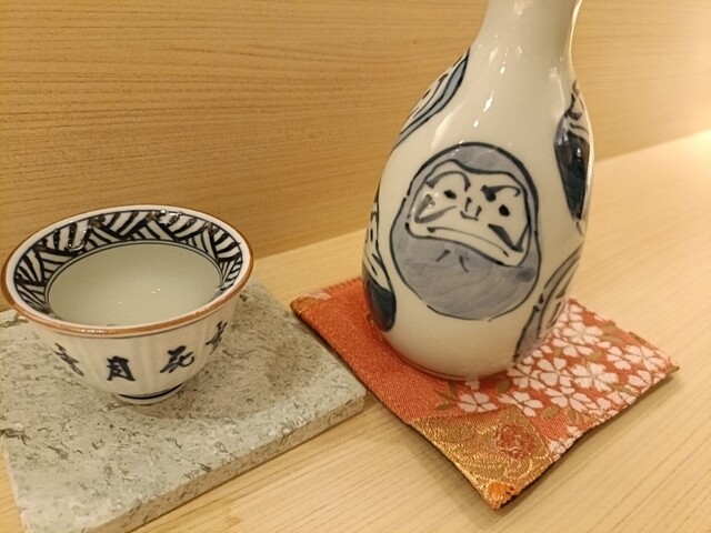 前回の7,000円ランチが良かったので、今回は7,500円のコースを予約。心配だった台風も影響なく、蒸し暑い中を10分歩いてお店へ到着。カウンター席へ腰を下ろたら、純米酒を温燗で注文。あとは店主の関さん、おまかせコースのスタート!