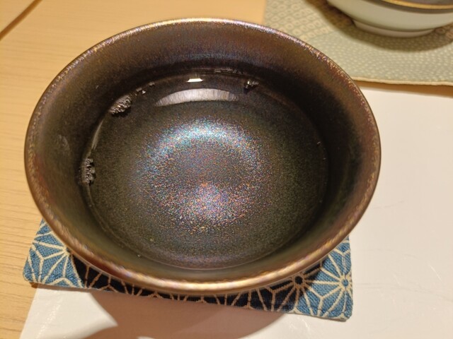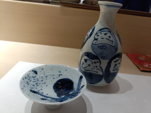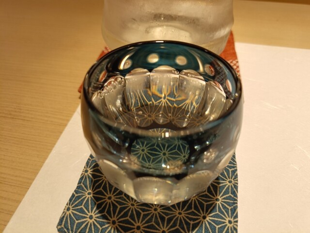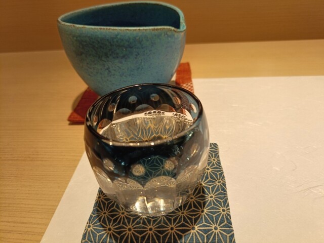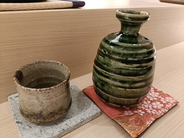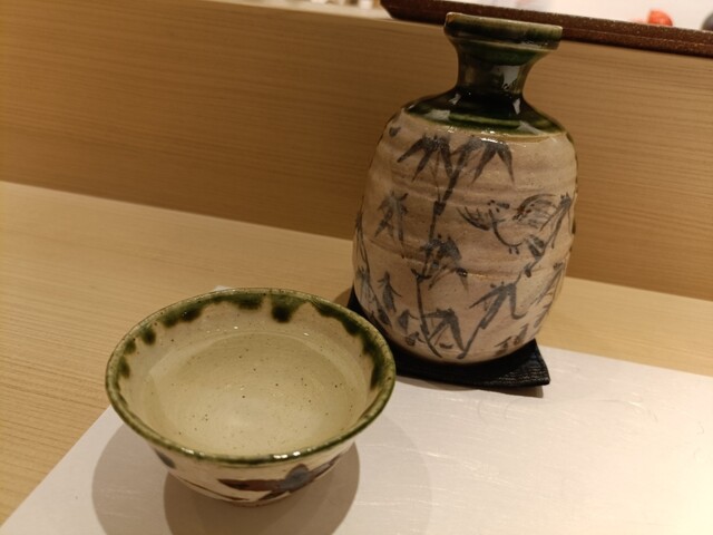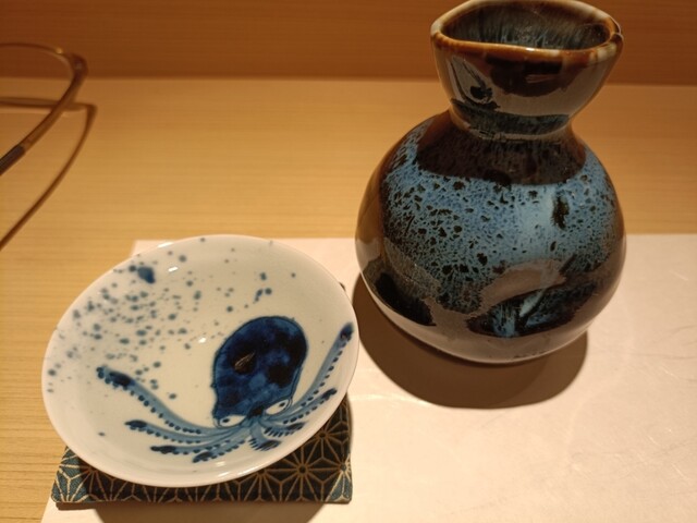この日のぬる燗は、大盃/至/大七の三種類。大盃で出された深緑色の徳利とお猪口は織部の焼き物で、他の陶器も素敵な色合い。これがまたお寿司の味を引き立てて…