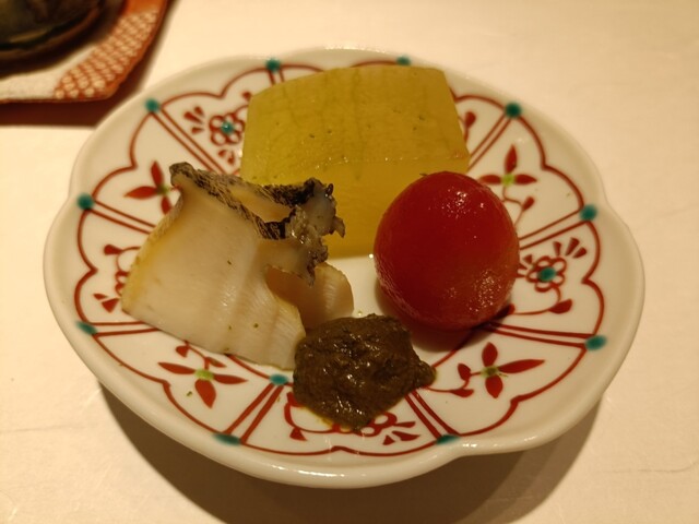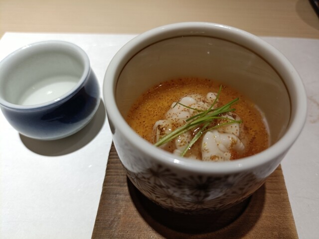 ほんのちょっとかじっただけで、ねっとり濃厚な旨味が口中に広がり、徳利の日本酒があっという間になくなりそうに。さらに追い打ちをかけるかのように、墨烏賊ゲソとミル貝ヒモの串焼き、程よい脂と旨味が楽しめる能登のサワラとマツカワガレイのお造り、そして、香箱ガニの外子のプチプチ感が堪らない白子の茶碗蒸し…などなど。