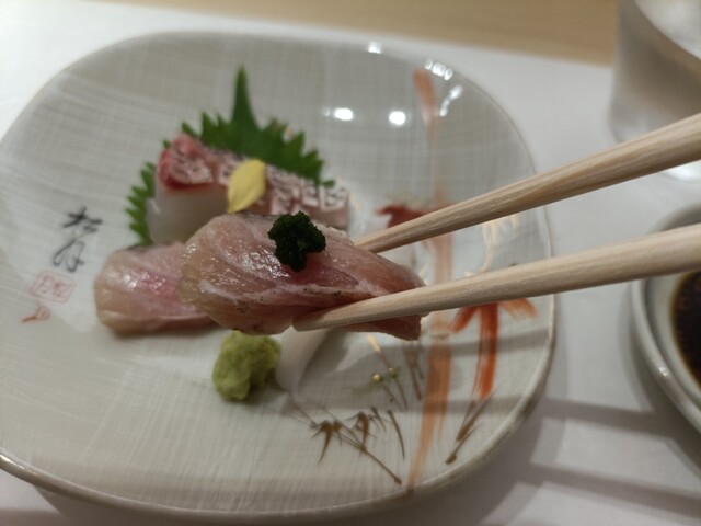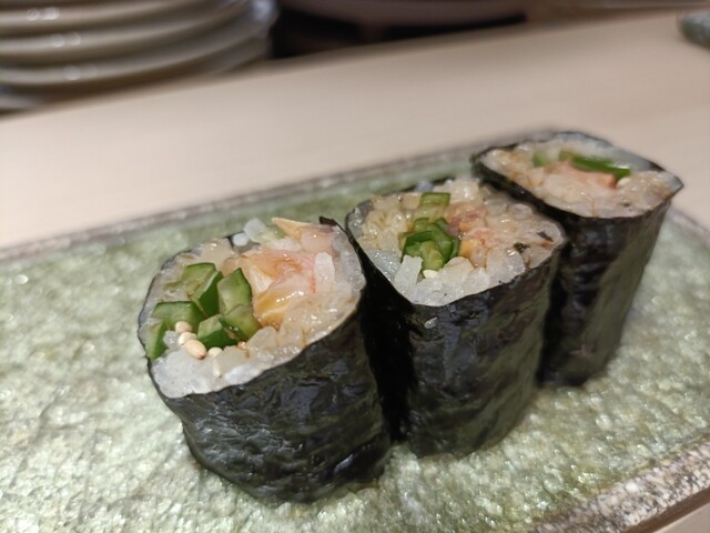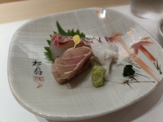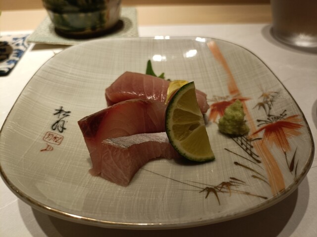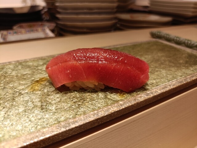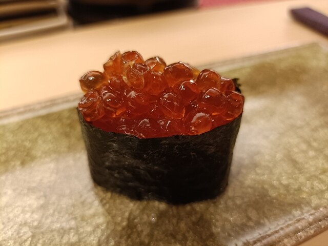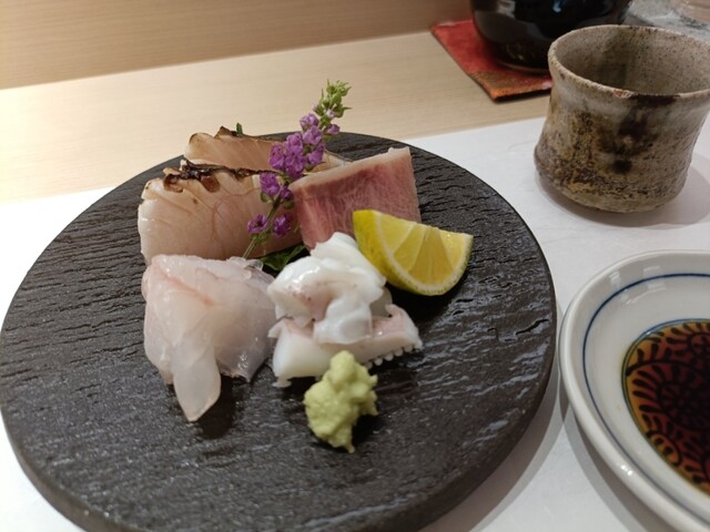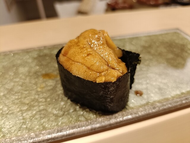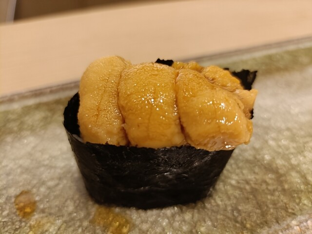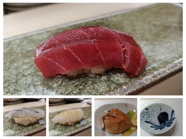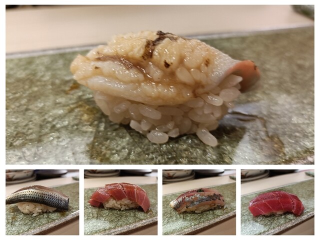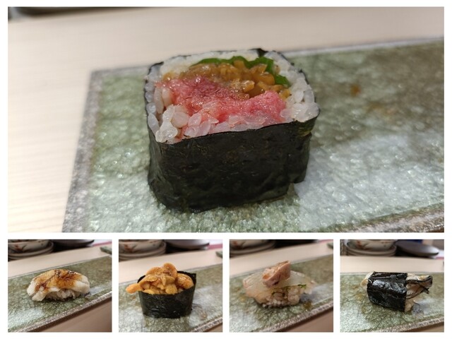握りは、キハタ(鹿児島)、スミイカ、アジ(大阪湾)、サンマ、小肌、漬けマグロ/中トロ(釧路沖)、中トロ、北寄貝炙り、黒ムツ、イクラ、バフンウニ、アナゴ、かすご酢締めなど