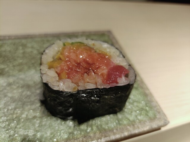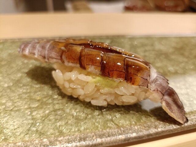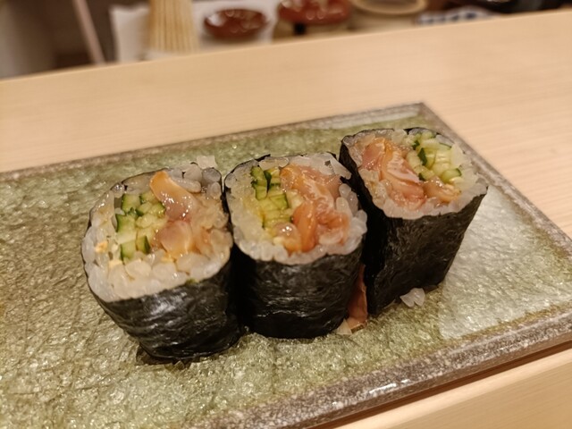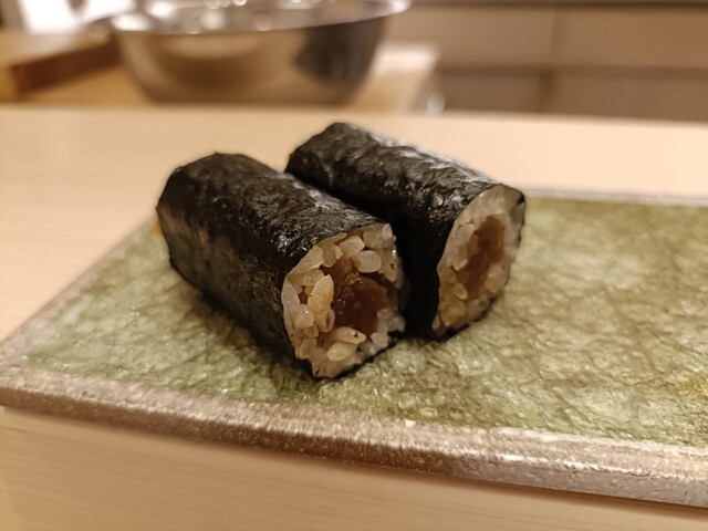 鮮烈なネタとふんわりした酢飯の握りは言う事なし。特にアナゴは、握る前に蒸し器にかけて、熱々フワフワの状態で出されたのに感動。巻物の海苔もパリパリで風味抜群。