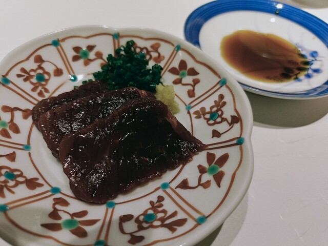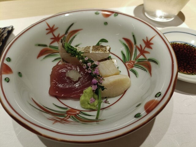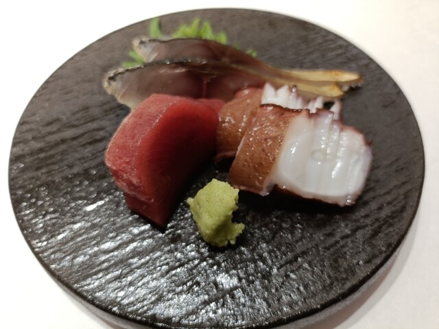 おつまみ:カマス炙り/刺盛り(三重の天然真鯛/千葉の太刀魚/ニタリクジラ)/茶碗蒸し(焼き椎茸/ホタテ貝柱/青海苔)