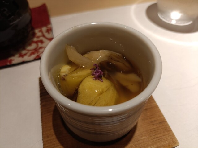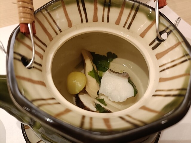 お気に入りのランチコースをぬる燗で。おつまみは、煎り銀杏(愛知県祖父江)、お造り(メジマグロ/鯛/スミイカゲソ)、松茸土瓶蒸し(岩手産/真鯛/銀杏)