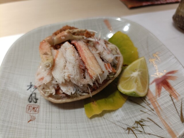 濃厚なカニ味噌や内子(オレンジ色の卵巣)と外子(茶色い粒状の卵)が特徴の、北陸地方で水揚げされるメスのズワイガニ。わずか2か月と言う短い漁期で水揚げされた、貴重な香箱ガニ…をこの日は運良く口にすることができ、その美しい見た目と味にめっちゃ感動…はさておき。