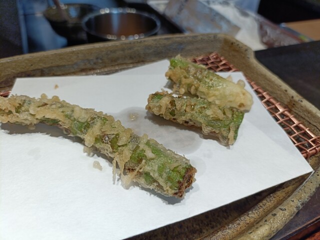 春の息吹を感じさせるタラの芽。熱々を頬張ると、独特の風味が口いっぱいに広がり、めっちゃハッピーな気分に。一方、トビの白子は、春巻きのようにラッピングされて揚げられたもの。半分に切ったものを口にすると、タラの白子とは別次元のトロトロ感と、濃厚な風味が楽しめる逸品。あとはいつもの定番メニュー、車海老、シロギス、メゴチ、ウニ大葉巻、アスパラ、獅子唐などを頂いて天ちゃでシメ。