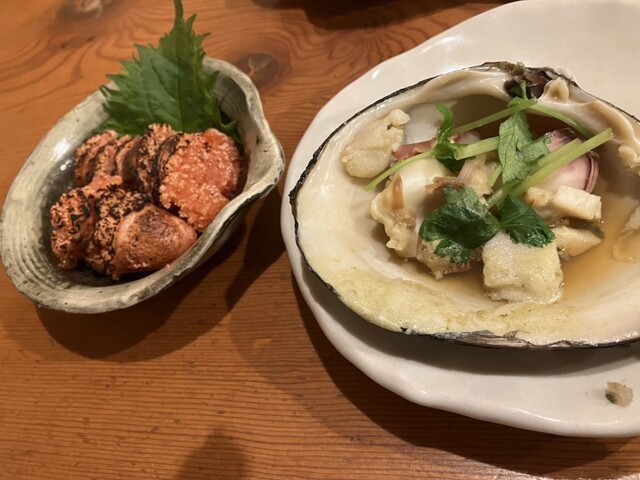 刺身盛り合わせ、酒蒸し、カキフライ、炙りタラコ、フグ皮ポン酢などなど。