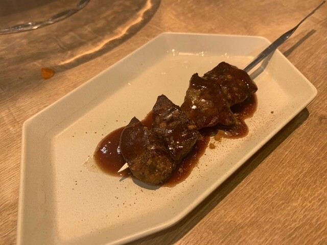 いわゆる焼き鳥のきもですが、赤ワインベースのコクがあるたれでフォアグラ風になってます。