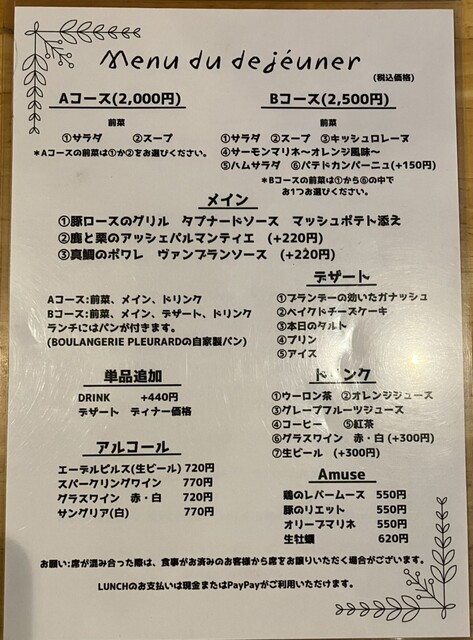 ランチコースにチーズと飲み放題がついて平日4000円土日祝は5000円とのこと。