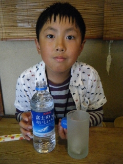 奥の厨房に一番近い小上がりの4人席をお借りしてメニューを眺めようかと思っていたら、大きな氷の入ったグラスとペットボトル入りのミネラルウォーターが提供されて驚かされます。
