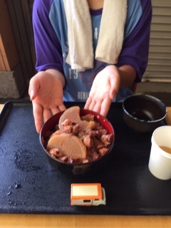 ご飯とともに新しい鍋から盛り付けてきたのはタコの煮物です。