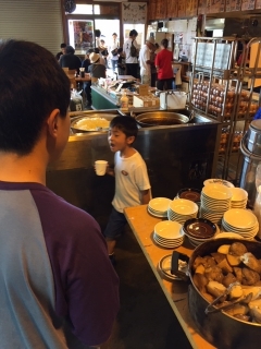 煮物や漬物、サラダなどは、待っている間に頂いていたものをセルフサービスで盛りつけます。