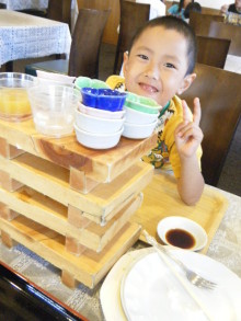 食事のスタイルはバイキング式なのですが、右手の部屋を利用する「得々ランチ(大人1,100円子ども700円)」と「セレブランチ(大人2,000円子ども1,000円)」は寿司をゲットしてからの先払い、左手の部屋を利用する「グルメランチ(税込550円)」は、用意されたワンプレートに思いのたけを詰め込んで会計を終えたら席に着きます。