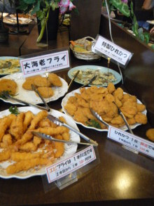 ズキマル君はオーソドックスなボリュームながらカキフライを10個も盛り付ける荒業プレートに1瓶400円ほどの量の鮭フレークを盛り付けてきました。