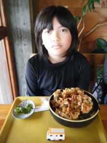 ドンブリから溢れんばかりのご飯の上に、適度なサイズに切られたジャンボ唐揚に甘辛のタレがタップリかかっています。