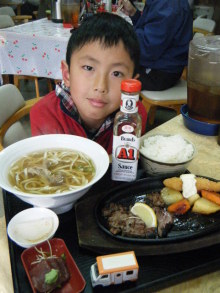 材料単価が高いので、ほかに比べるとややコンパクトに見えますが、100gほどのステーキにエビフライ、鉄板焼き野菜がワンプレートに載った他に、沖縄そばとライス、刺身に漬物がセットになっているので、満足できること間違いなしです。