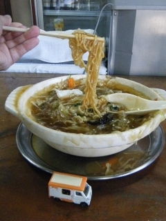 やっと掘り出した麺は中太のかん水が効いた腰の強いタイプで、ちょっとやそっとで伸びてしまうことはありません。
