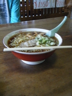オーソドックスなしょうゆ系スープにチャーシューとシナチクと刻みネギが載っています。