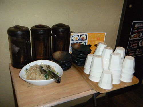 水はセルフサービスですが、付け合せのモヤシ炒めも取り放題なのでかなりうれしいです。