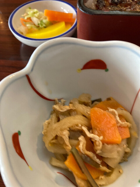 鰻重,椎茸のお吸い物,漬物,昆布の煮物という何でもない普通のセットですが,値段以上の価値ある美味しさです。