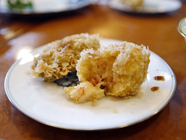 エビコロッケにカキフライ。エビグラタンを揚げたかのようななめらかさ。ぶつ切りのエビがゴロゴロ入ってサックリ揚がったパン粉衣と混じり合う。