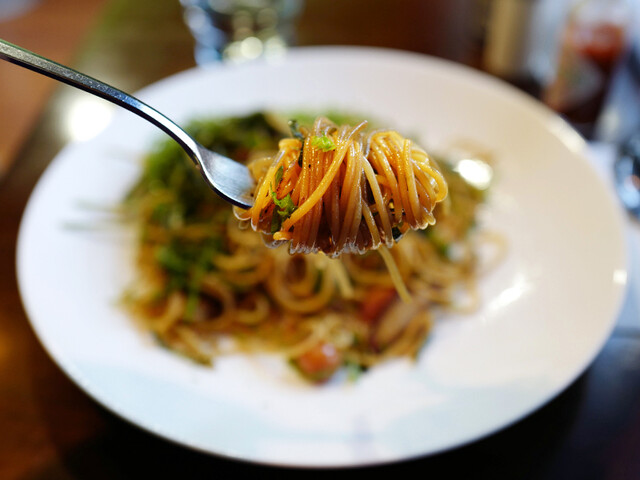 ジャジャッジャジャッと厨房の方からパスタを炒める湿った音がしておいしい音がそれに続いてやってくる。