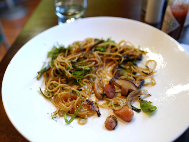大葉に混じって切り海苔たっぷり。ソーセージに玉ねぎ、ピーマン、椎茸と具材がどれもしっかり焼かれて香ばしく、マッシュルームじゃなくて椎茸というところが焼きそば的で和風な感じ。オモシロイ。