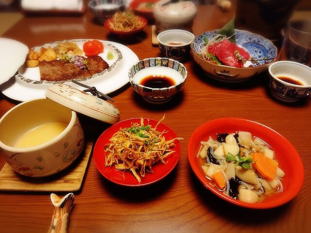 前菜や、こづゆ、揚げたごぼうを熱々味噌だれに絡めていただくお料理もうますぎやん。