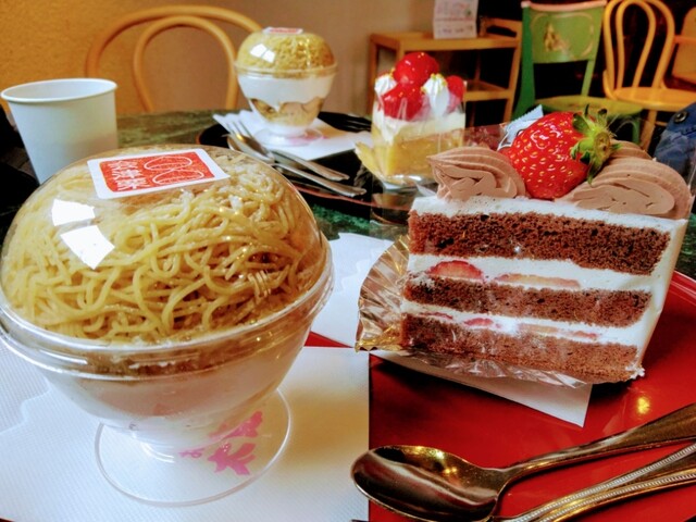 ワタクシは、二月限定という、イチゴチョコショートケーキ、会津栗のモンブランを。