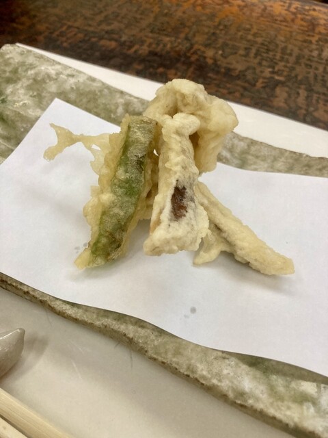 揚げ物はメヒカリ、海老芋、オクラ、旨い藻塩でいただく。