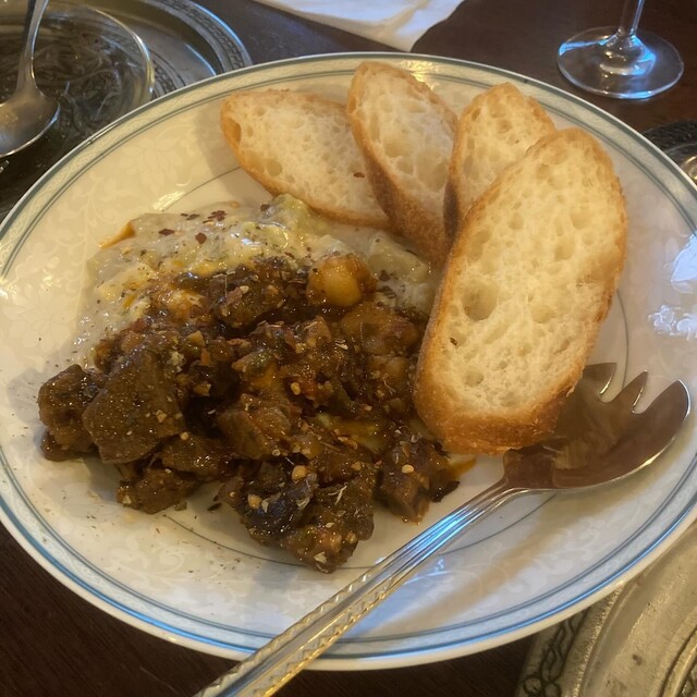 Instagramで見て食べたかったヒュンキャルベーンディ、シガラボレイ(白チーズの春巻き)、メルジメッキキョフテ(レンズ豆とひきわり小麦の団子)、フムス(ひよこ豆のペースト)、ムジュベル(ズッキーニとチーズのお焼き)、マントゥサラダ(ヨーグルト&ミントのパスタを使ったサラダ)、ウズガラキョフテ(トルコ風ハンバーグ)、トルティーヤで肉と野菜を巻いて食します。最後にご飯もののムサカ。クミンの香り豊かでピリッとスパイシー。