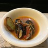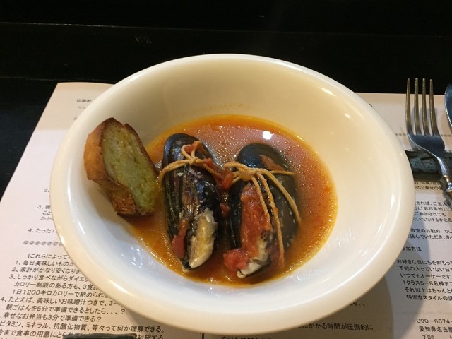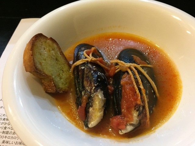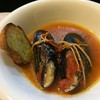焼き立て山猫パンのガーリックトーストとムール貝のインボルティーニスープ仕立て