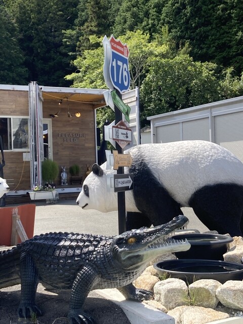 (スピード違反取り締まりを模した本物そっくりの警察官とパトカーの「オブジェ」が設置されています)