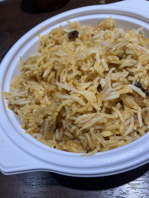 締めに魚のビリヤニを注文しました。本日の魚からタラを勧められて頂きました。絶妙な味付けでとても美味しかった。食べきれなかったので、100円で容器に入れてテイクアウトしました。ご馳走様でした。