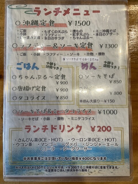 ラフティー、ゴーヤチャンプル、ジーマミー豆腐、沖縄そばと沖縄料理のメジャー所が揃っていて、サラダには海ぶどう、紅芋の天ぷら、もずくの天ぷらと沖縄らしい食材も多い。