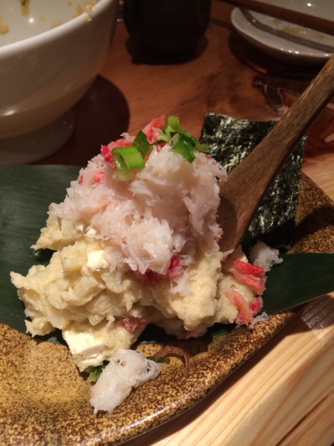 なめらかなポテトサラダに蟹味噌の風味があり、かに身もかなりたっぷり乗ってます。海苔で巻いて食べるスタイルが素敵です。