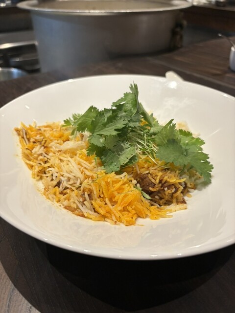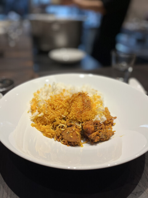 ちなみにビールやジンジャービア飲んでも大丈夫そうだったので、もちろんそちらでも。時間になったらドーンと炊き上がったビリヤニが運ばれてきて、目の前で配膳してくださいます。このお店、BGMがありません!それだけ真っ直ぐビリヤニに向き合ってほしい、という大澤さんの意気込みを感じます。手食するかとも聞かれますが、今回は遠慮することに。手食用はお皿が違うようです。月に2名ほどいるとのこと、私も次はチャレンジしようかな。