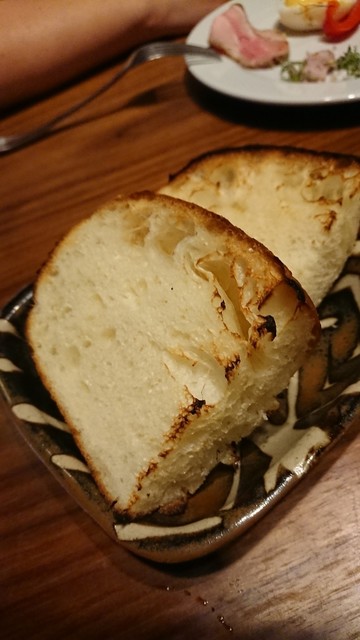 途中で出していただいたパン(フォカッチャ)なのですが、これがまたバターの香りがよく、そのまま食べても甘みがあって、すごくおいしかった。パテを塗って食べるのですけれど、ついつい……なにもつけずに食べてしまった(笑)