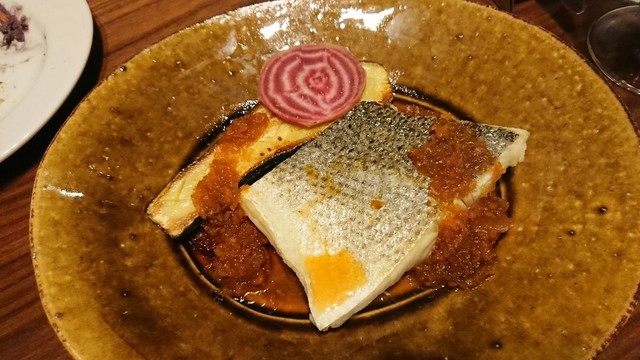 おさかな……スズキ。添えられているのは、茄子ではなくてズッキーニ、そしてビーツ。