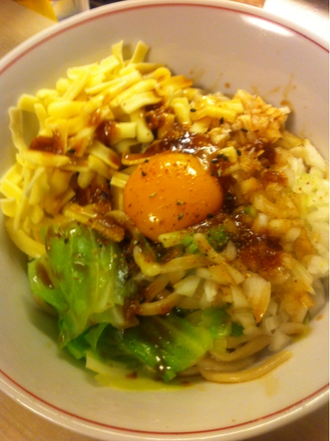 汁なしには玉ネギ、ニンニク、茹でキャベツ、生卵、チーズを入れましたがなかなか旨かった。