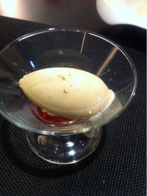 デセール:庄内茄子の焼き茄子アイスクリームとヴァニラ風味のフルーツトマトを添えて