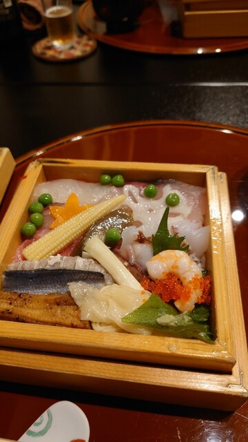 返し寿司は、江戸時代倹約令が出されていた頃、表は質素なものにして、裏を返すと超豪華なちらし寿司が現れるというもの。穴子、シャコ、エビ、タコ、ままかりなどがギッシリ乗っていて豪勢なもの。