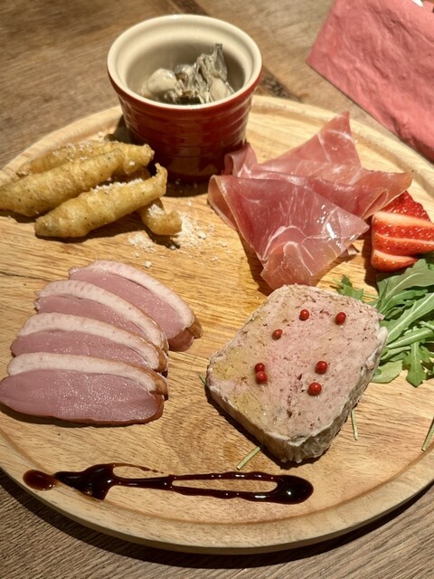 前菜5種盛りとアヒージョをふたつ、カマンベール&プチトマトと、タコのトマトソース