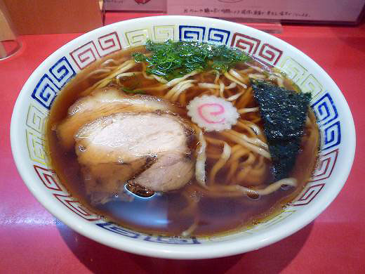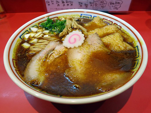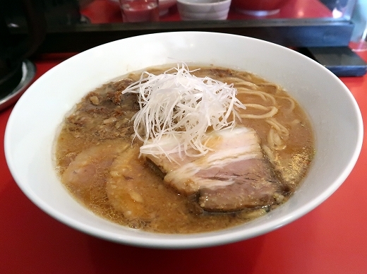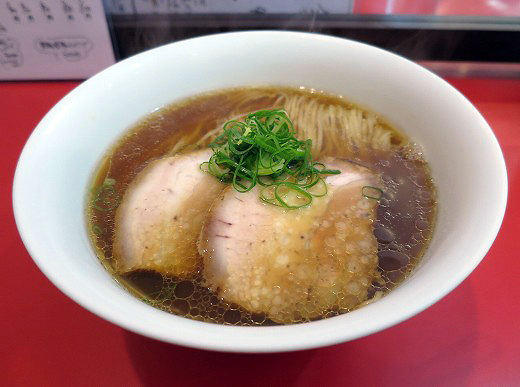 スープは魚介ベースの醤油味。麺は平打ちの太ストレート麺。具はウデ肉のチャーシュー,白ネギ,海苔を使用。