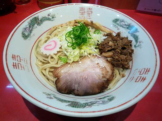 スープは鶏豚ベースの魚介醤油味。麺は平打ちの中太ストレート麺。具はバラ肉とウデ肉のチャーシュー,笹切りネギ,刻み白ネギ,穂先メンマ,ナルトを使用。